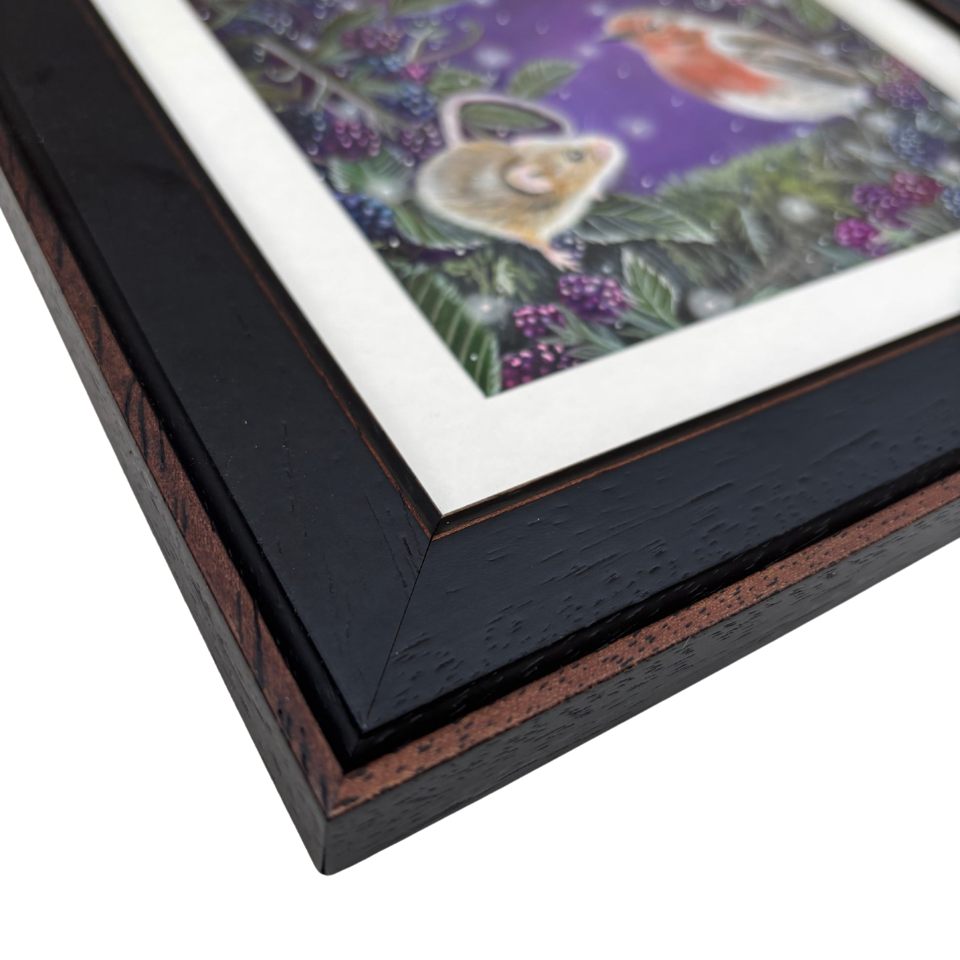 A quiet moment of connection between a tiny harvest mouse and a Robin red breast beneath a tangle of Bramble laden branches. This painting evokes the hidden magic of the wild, where even the tiniest encounters feel like whispered secrets of the woodland.